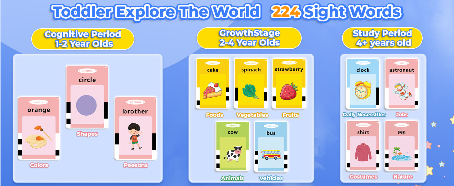 - 【Interesting Learning Experience】- kids toys contain 112 sight words flash cards - 224 words. Your baby can learn different animals, vehicles, foods, fruits, colors, vegetables, daily necessities, costumes, nature, persons, jobs and shapes. It is great for kids to recognizing, reading, spelling common words and improving their reading progress.